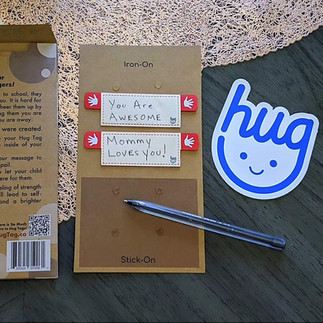 🩷 Hugtags are so easy to use! All you need to do is Simply write a message of positivity and love. It can be anything your child relates to; a message, their name, even a happy face. Something they recognize as you.Then, stick or iron the message under their shirt. They will have something to see and feel that let’s them know you are still there, that they are loved. Even when they are away from home.